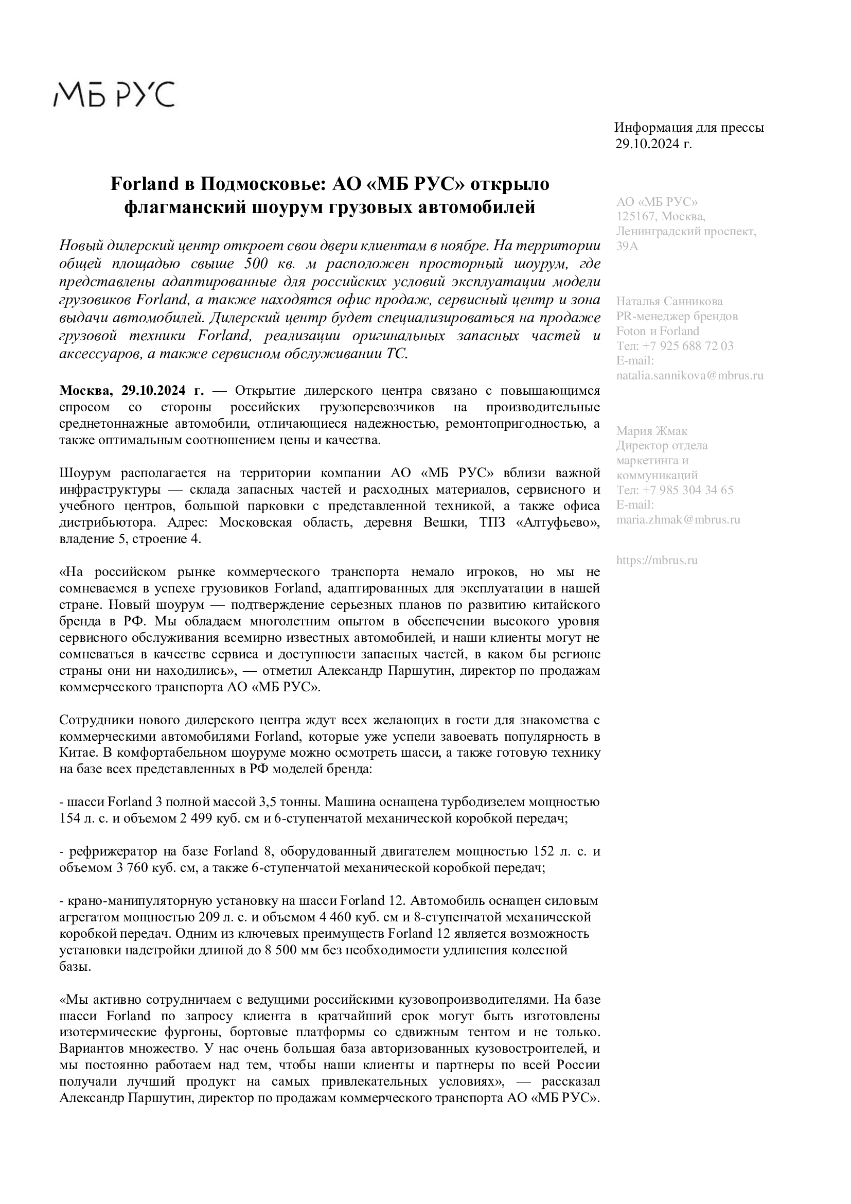 «На российском рынке коммерческого транспорта немало игроков, но мы не сомневаемся в успехе грузовиков Forland, адаптированных для эксплуатации в нашей стране. Новый шоурум — подтверждение серьезных планов по развитию китайского бренда в РФ. Мы обладаем многолетним опытом в обеспечении высокого уровня сервисного обслуживания всемирно известных автомобилей, и наши клиенты могут не сомневаться в качестве сервиса и доступности запасных частей, в каком бы регионе страны они ни находились», — отметил Александр Паршутин, директор по продажам коммерческого транспорта АО «МБ РУС».
